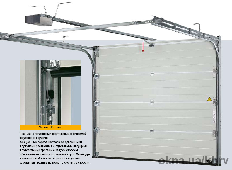 - з системою пружин розтягнення, направляюча Z: дві подвійні пружини кожна з парою несучих тросів, для воріт шириною до 3000мм висотою до 2625мм, висота перемички не менше 100мм;