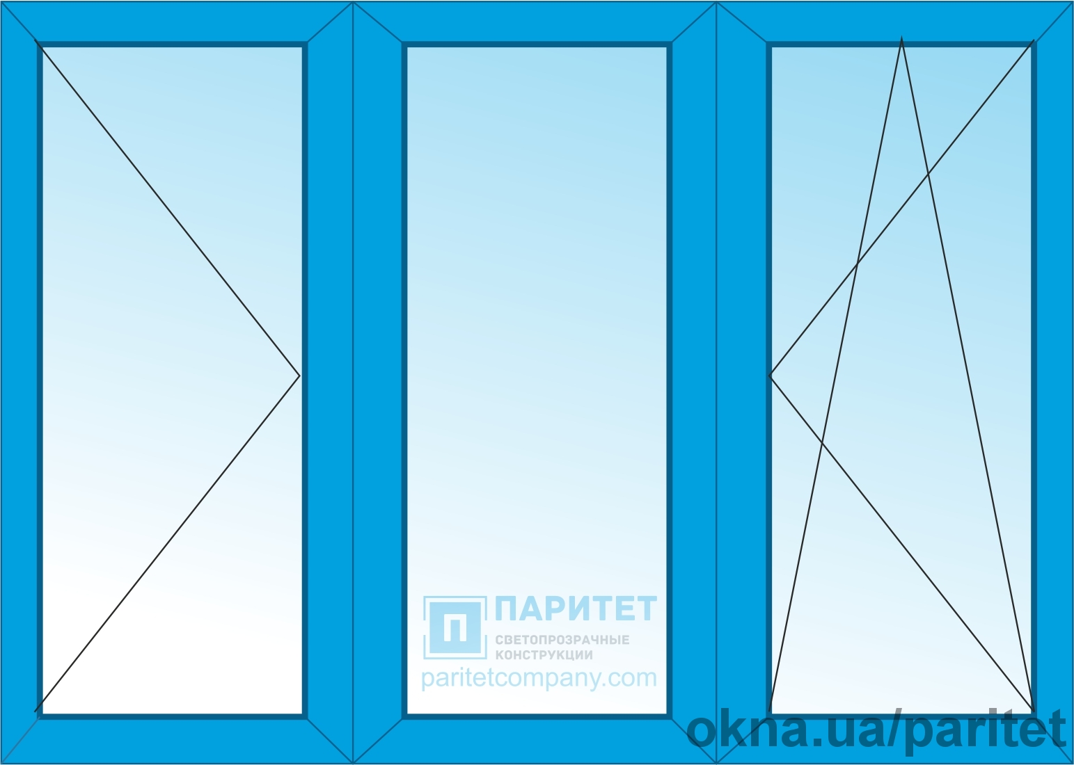 Трехстворчатые окна - очень популярный вариант для застекление больших оконных проемов, а так же установки для лоджии. Ширина створок может различаться.
