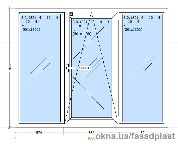 Металопластикове вікно трьохстулкове, центральна стулка поворотно-відкидна: