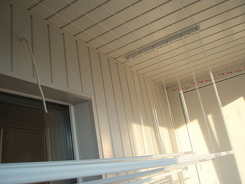 Обшивка вагонкой балкона с реализованной системой сушки вещей
